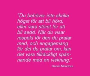Du behöver inte skrika för att bli hörd! Publicerad den 2012/01/28 av elaineatcquence När du visar respekt för den du pratar med, och engagemang för det du pratar om…….. Dela gärna, TACK:Tweet Klicka för att e-posta en länk till en vän (Öppnas i ett nytt fönster) E-post Klicka för utskrift (Öppnas i ett nytt fönster) Skriv ut Gilla Laddar in …