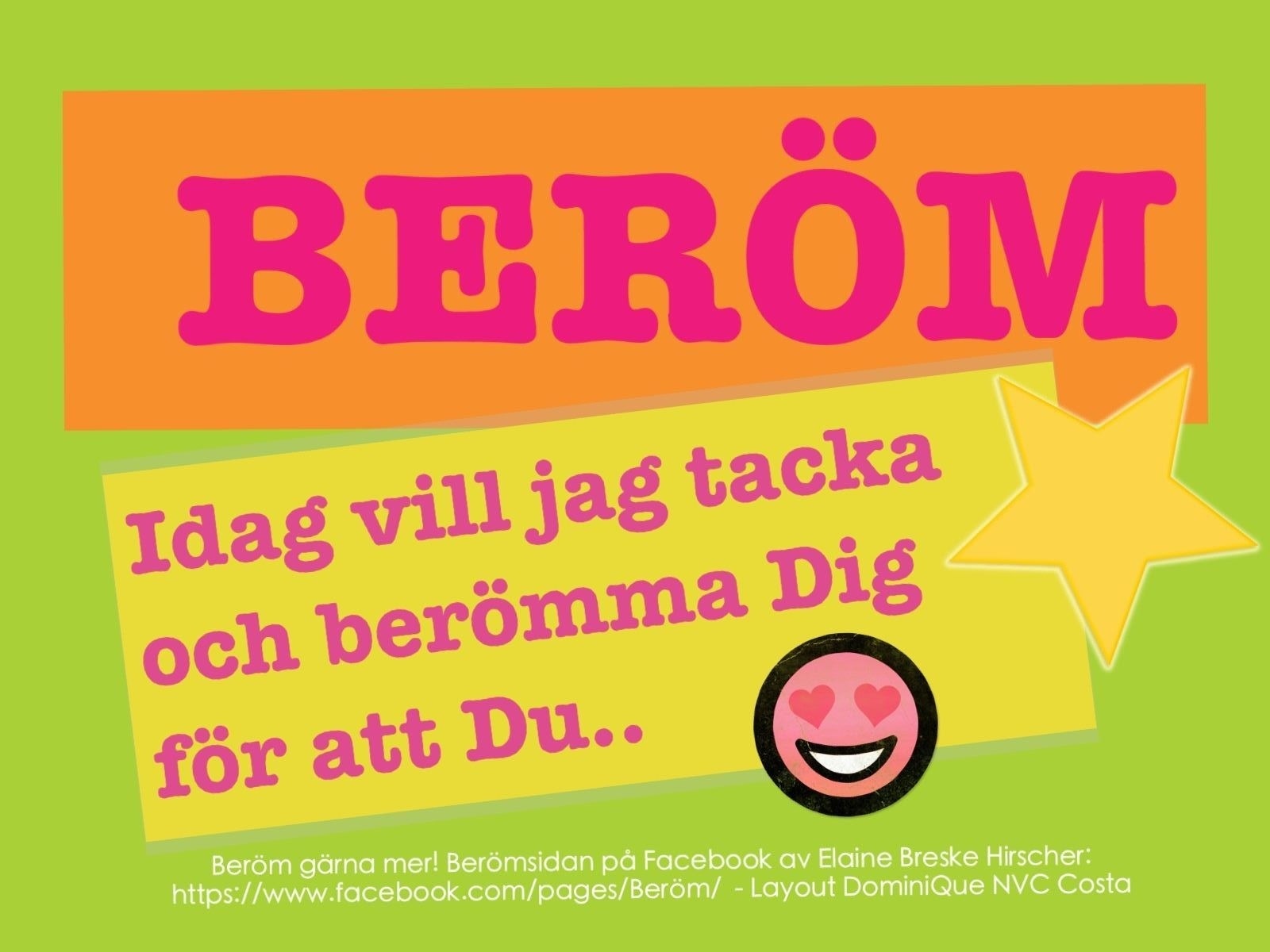 Att ge beröm! Publicerad den 2013/05/12 av elaineatcquence Ge beröm – den du ger mår bra av att få beröm, du som ger mår bra av att ge beröm. Vi har alla ett behov av bekräftelse och beröm och det kostar oss inget att sprida det kring oss så länge det är ärligt menat såklart. Beröm mer! Dela gärna, TACK:Tweet Klicka för att e-posta en länk till en vän (Öppnas i ett nytt fönster) E-post Klicka för utskrift (Öppnas i ett nytt fönster) Skriv ut Gilla Laddar in …