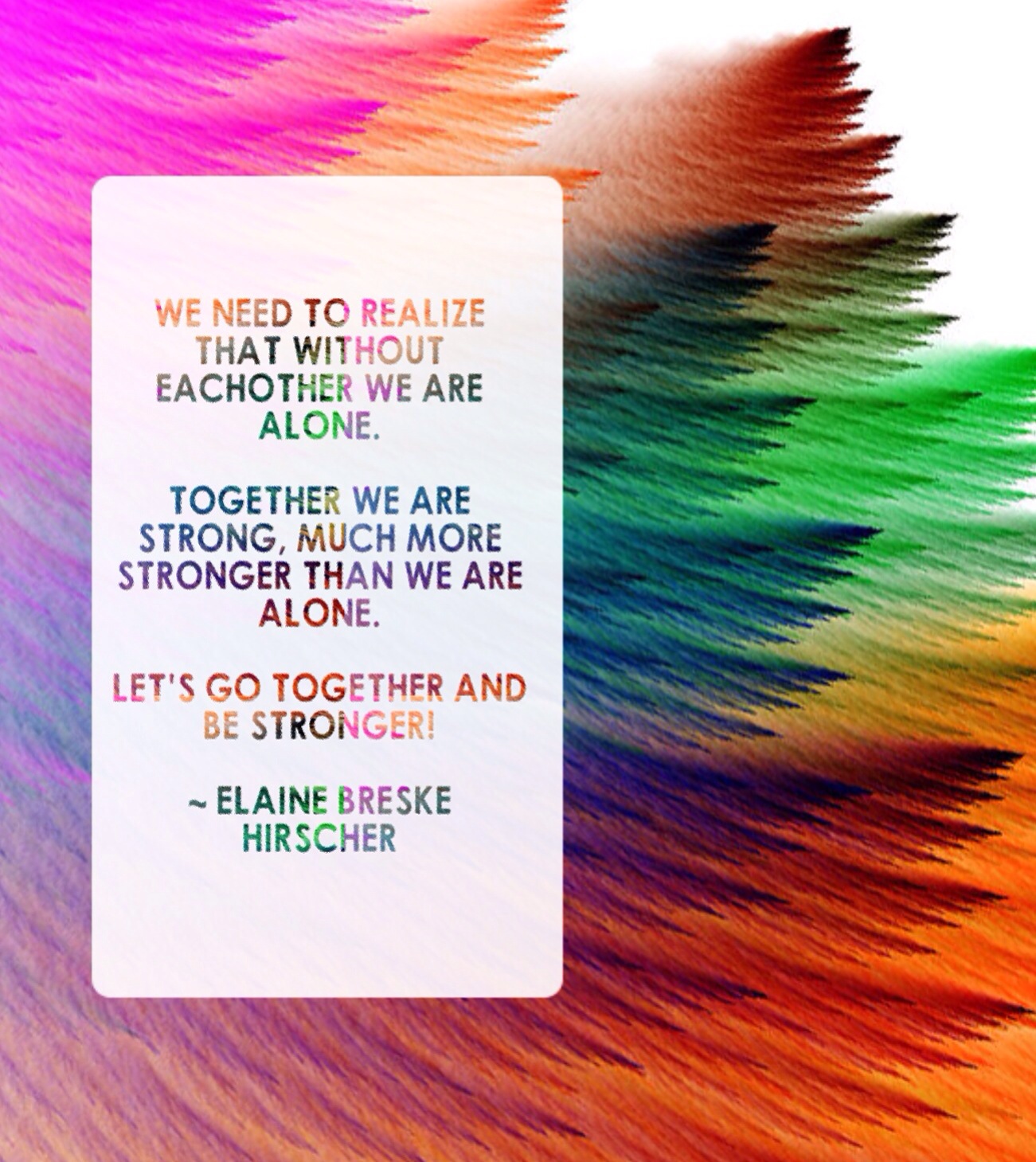 Let’s go side by side – together! Publicerad den 2014/01/13 av elaineatcquence We need to realize that without eachother we are alone. Together we are strong, much more stronger than we are alone. Let’s go together and be stronger! ~ Elaine Breske Hirscher 59.313470 18.231512 Dela gärna, TACK:Tweet Klicka för att e-posta en länk till en vän (Öppnas i ett nytt fönster) E-post Klicka för utskrift (Öppnas i ett nytt fönster) Skriv ut Gilla Laddar in …