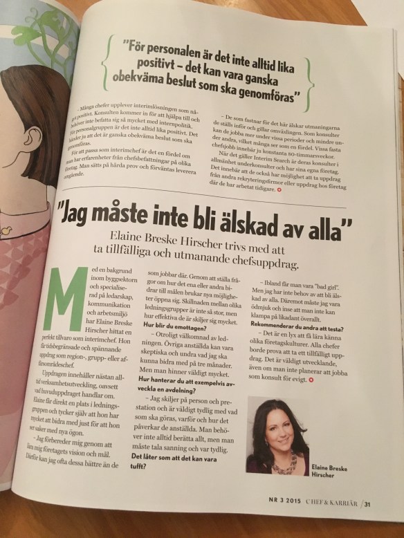 Hyr en chef Publicerad den 2015/11/26 av elaineatcquence I det senaste numret av chef och karriär intervjuas jag om livet som interimchef. Förstora gärna bilden för att läsa hela artikeln. Dela gärna, TACK:Tweet Klicka för att e-posta en länk till en vän (Öppnas i ett nytt fönster) E-post Klicka för utskrift (Öppnas i ett nytt fönster) Skriv ut Gilla Laddar in …